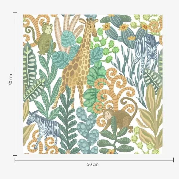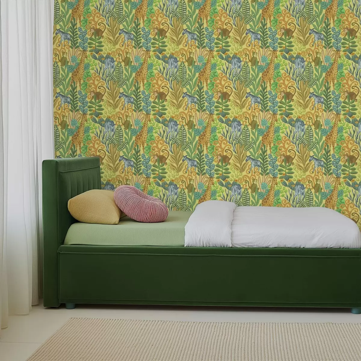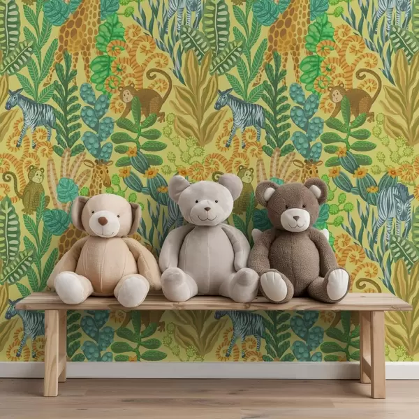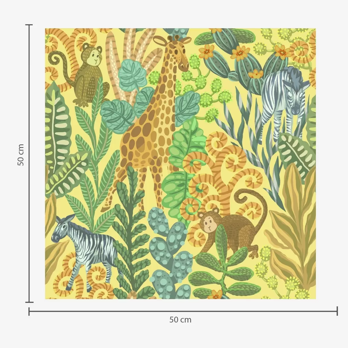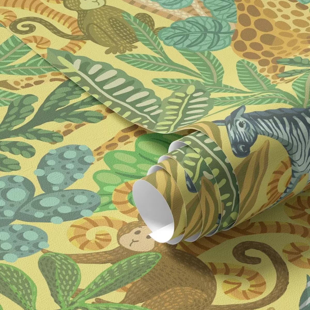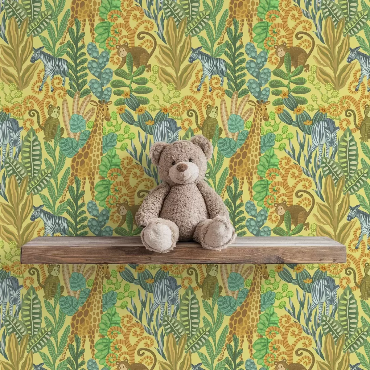 Tapeta Žirafa, zebra in opica v svetlo rumeni savani Št. a01000v1