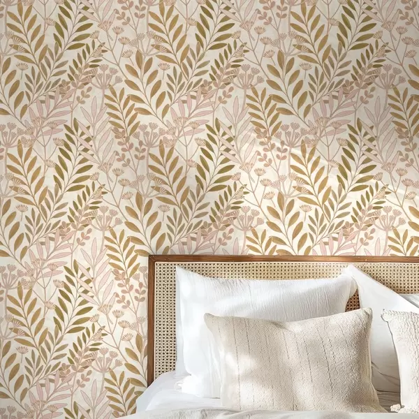 Tapeta Lahkotni botanični vzorec z nežnimi rožnatimi in ovsenimi listi Št. a01020v1