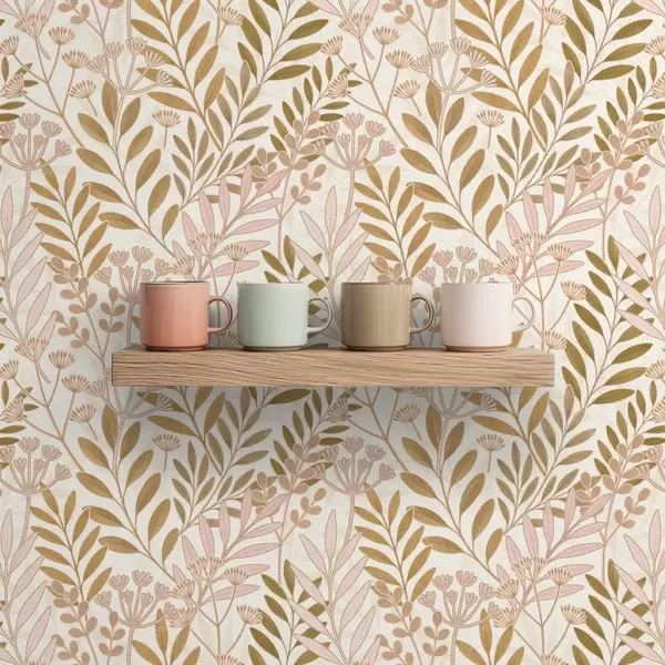 Tapeta Lahkotni botanični vzorec z nežnimi rožnatimi in ovsenimi listi Št. a01020v1