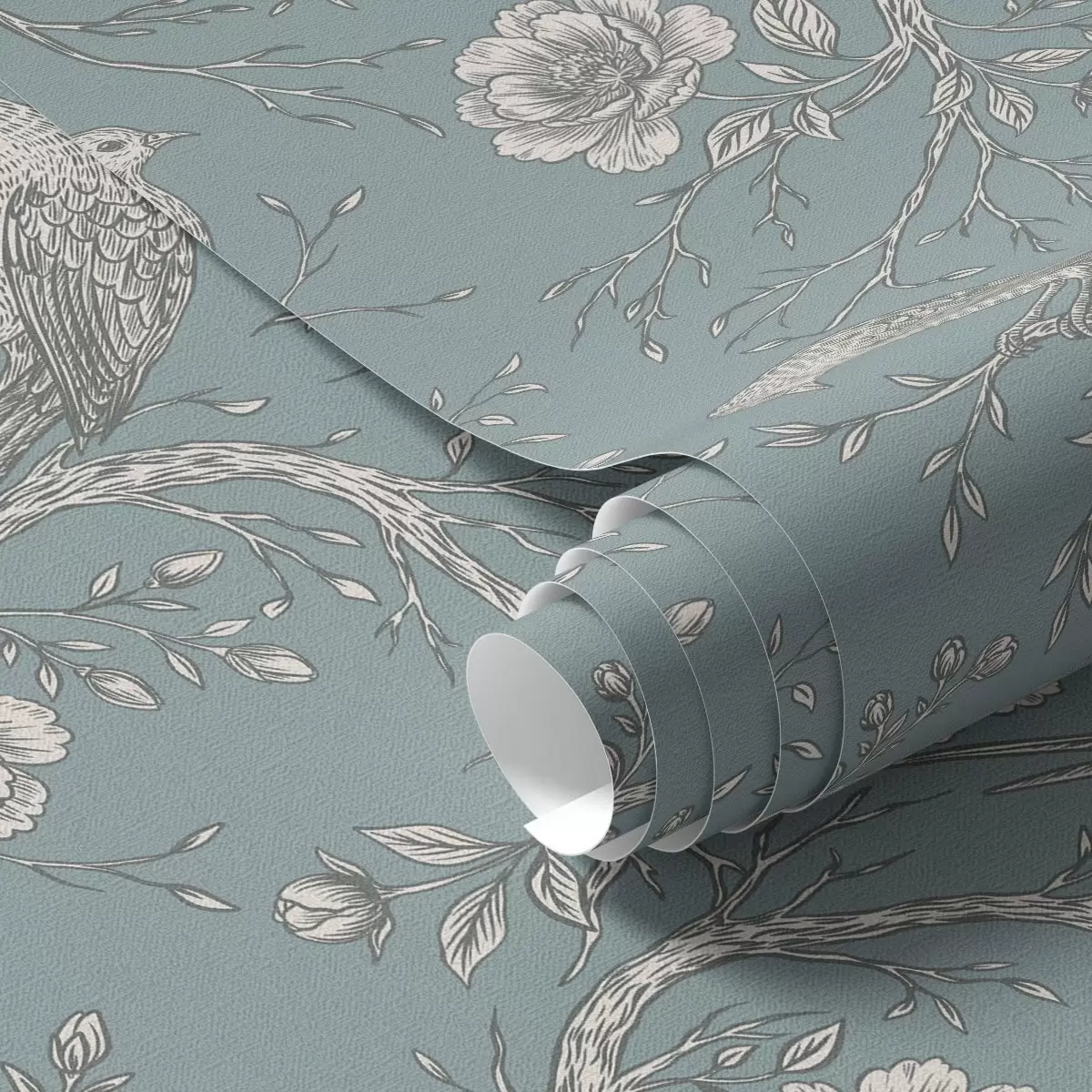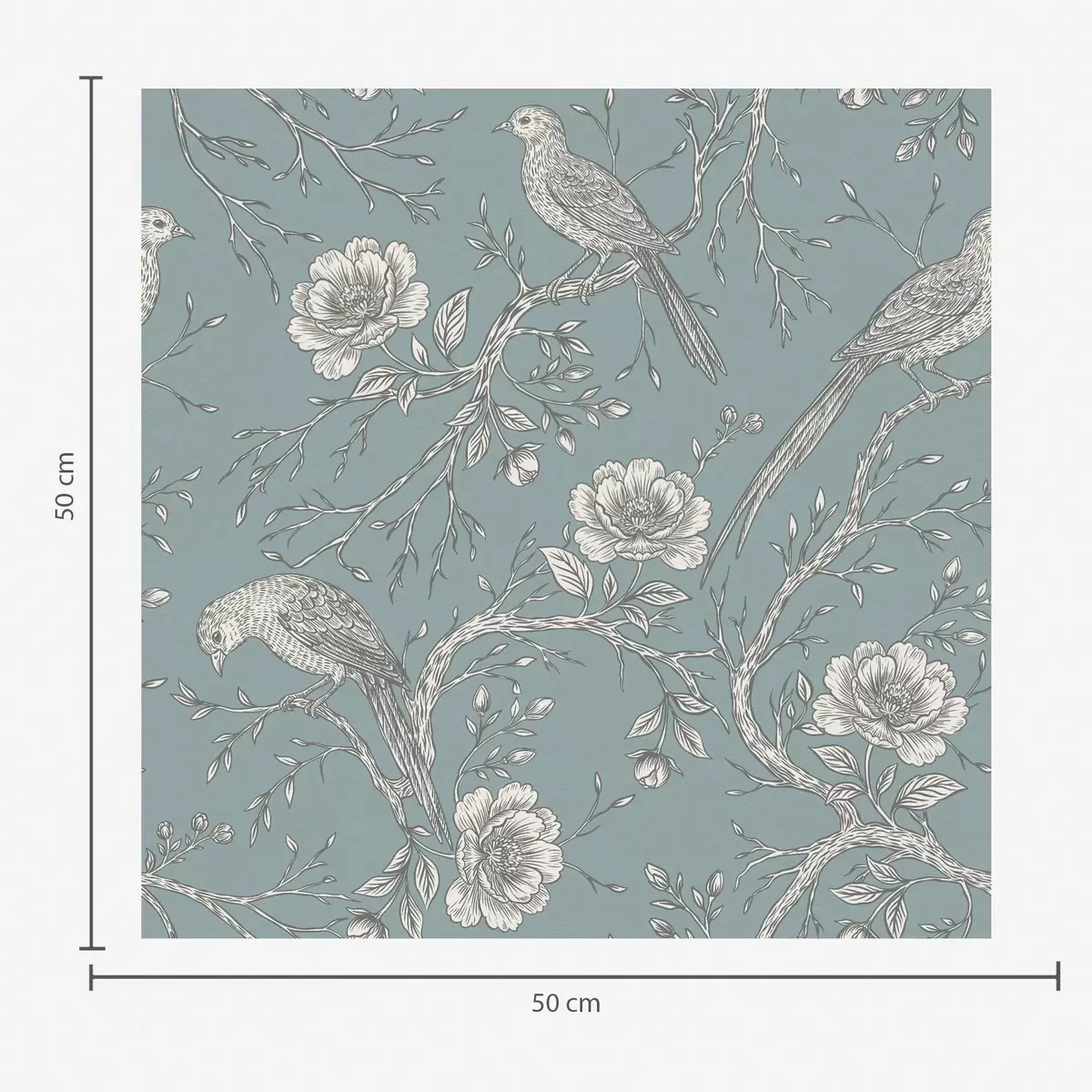 Tapeta Ptice, narisane v obrisih, na vejah, na nevtralnem modrem ozadju Št. a01022