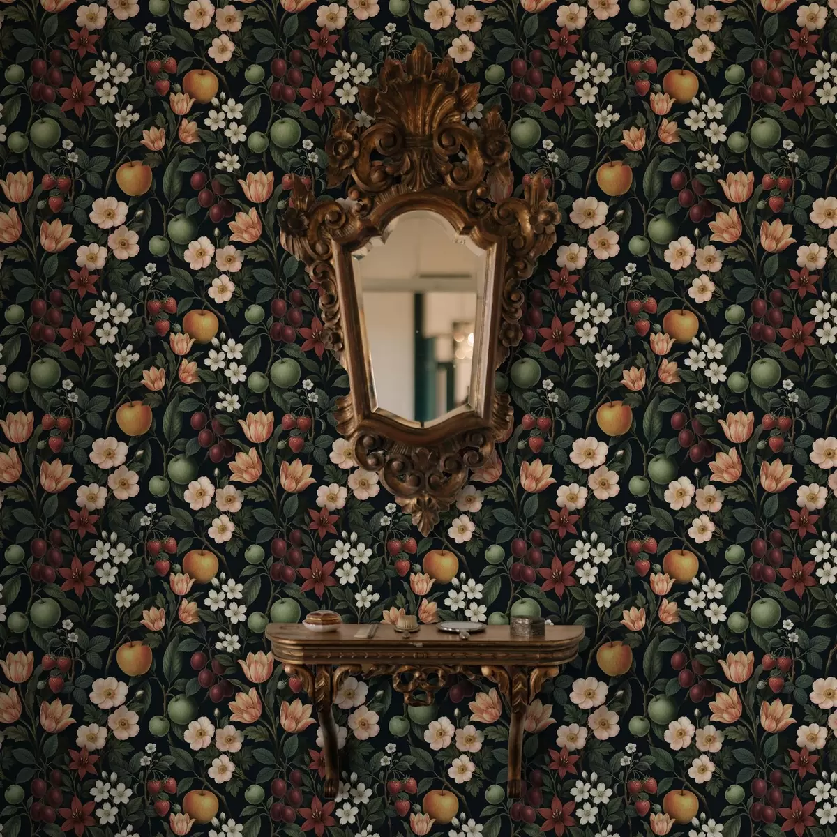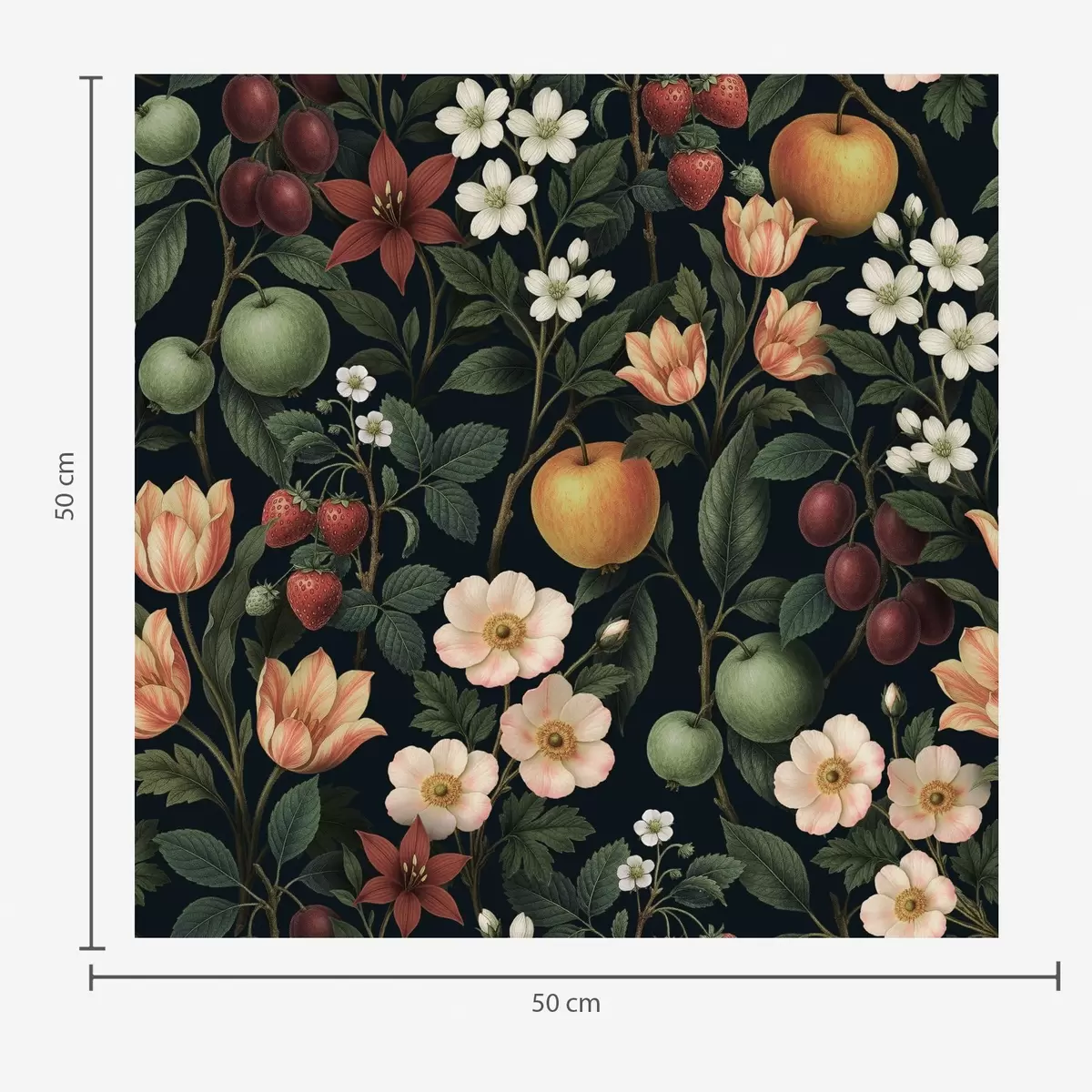 Tapeta Temni vrt s cvetjem, zrelimi jabolki in jagodami Št. a01034