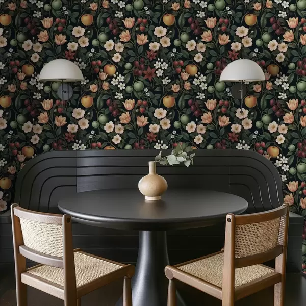 Tapeta Temni vrt s cvetjem, zrelimi jabolki in jagodami Št. a01034