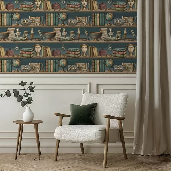 Tapeta Vintage police s knjigami, globusom in morskimi zanimivostmi Št. a01036