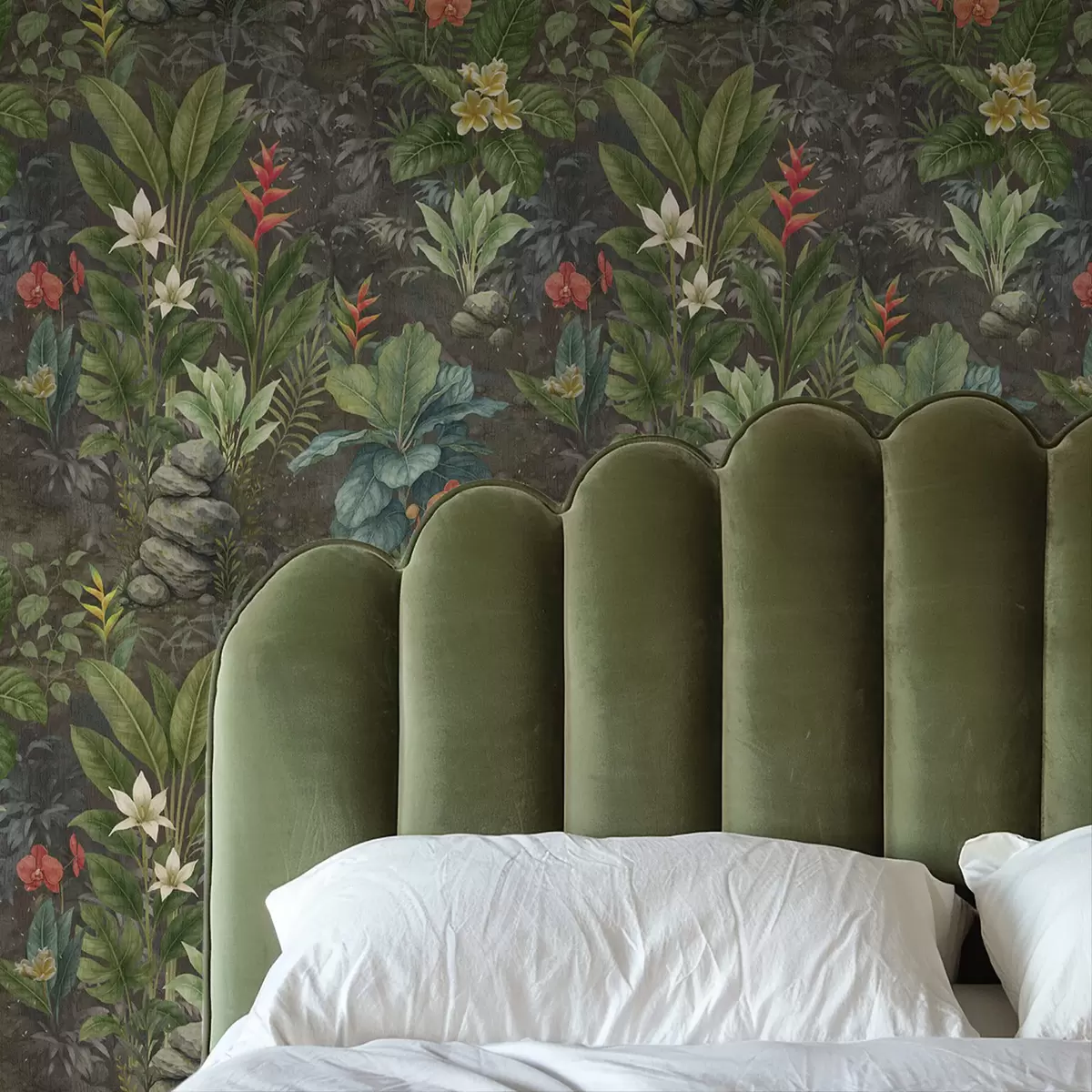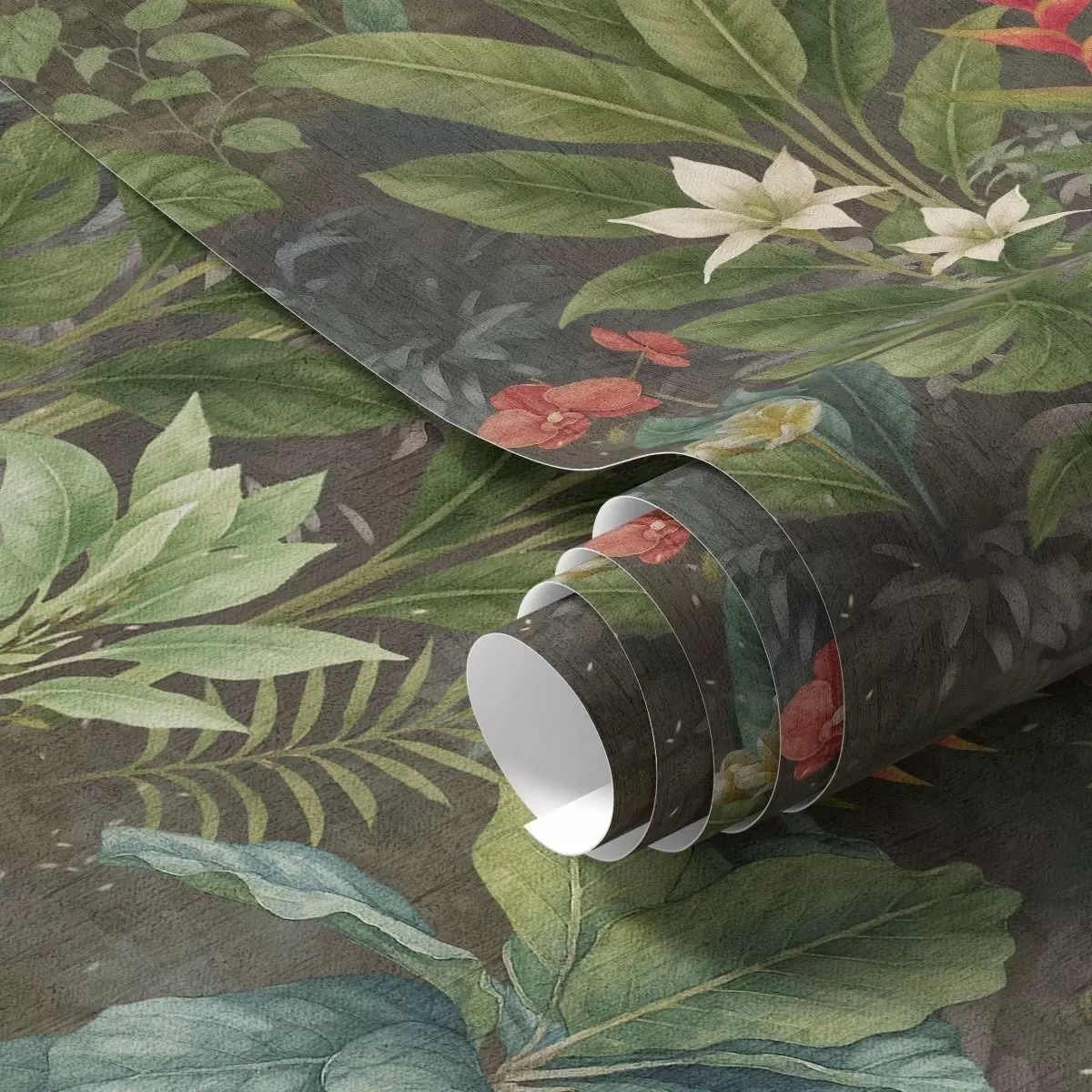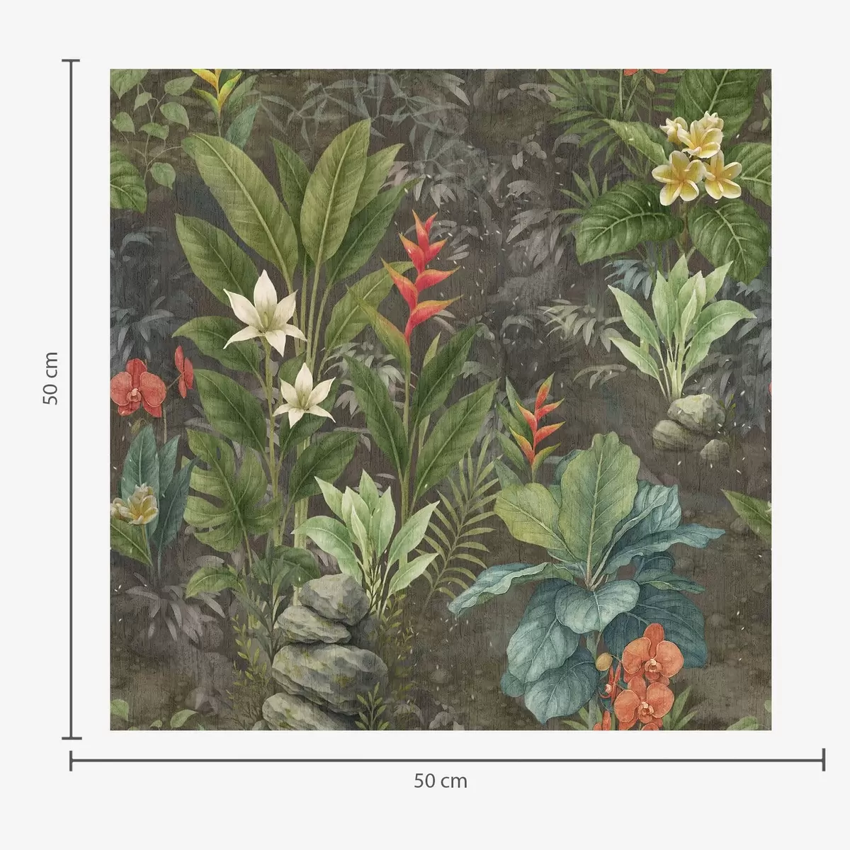 Tapeta Temni tropski vrt s svetlimi cvetovi in listjem Št. a01079