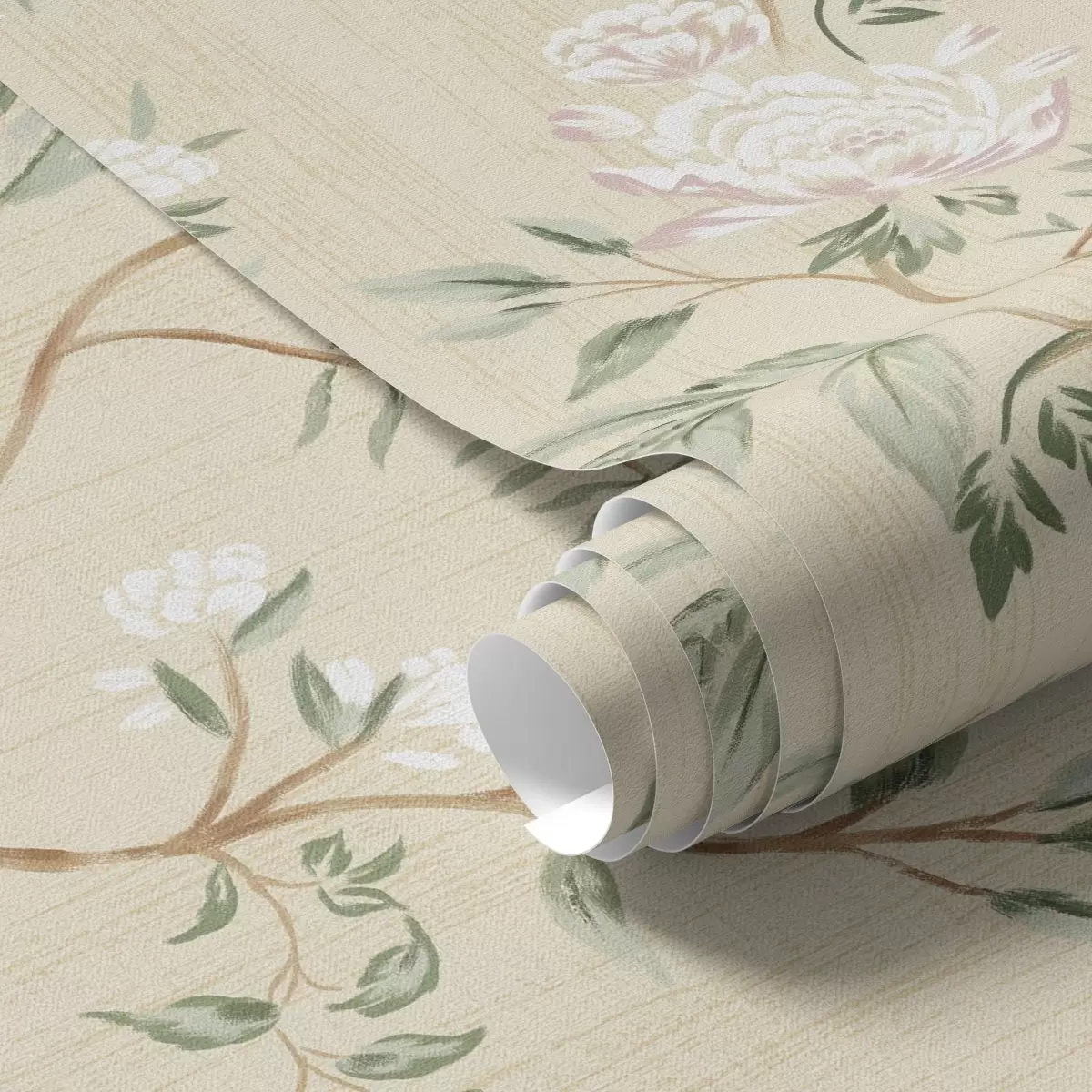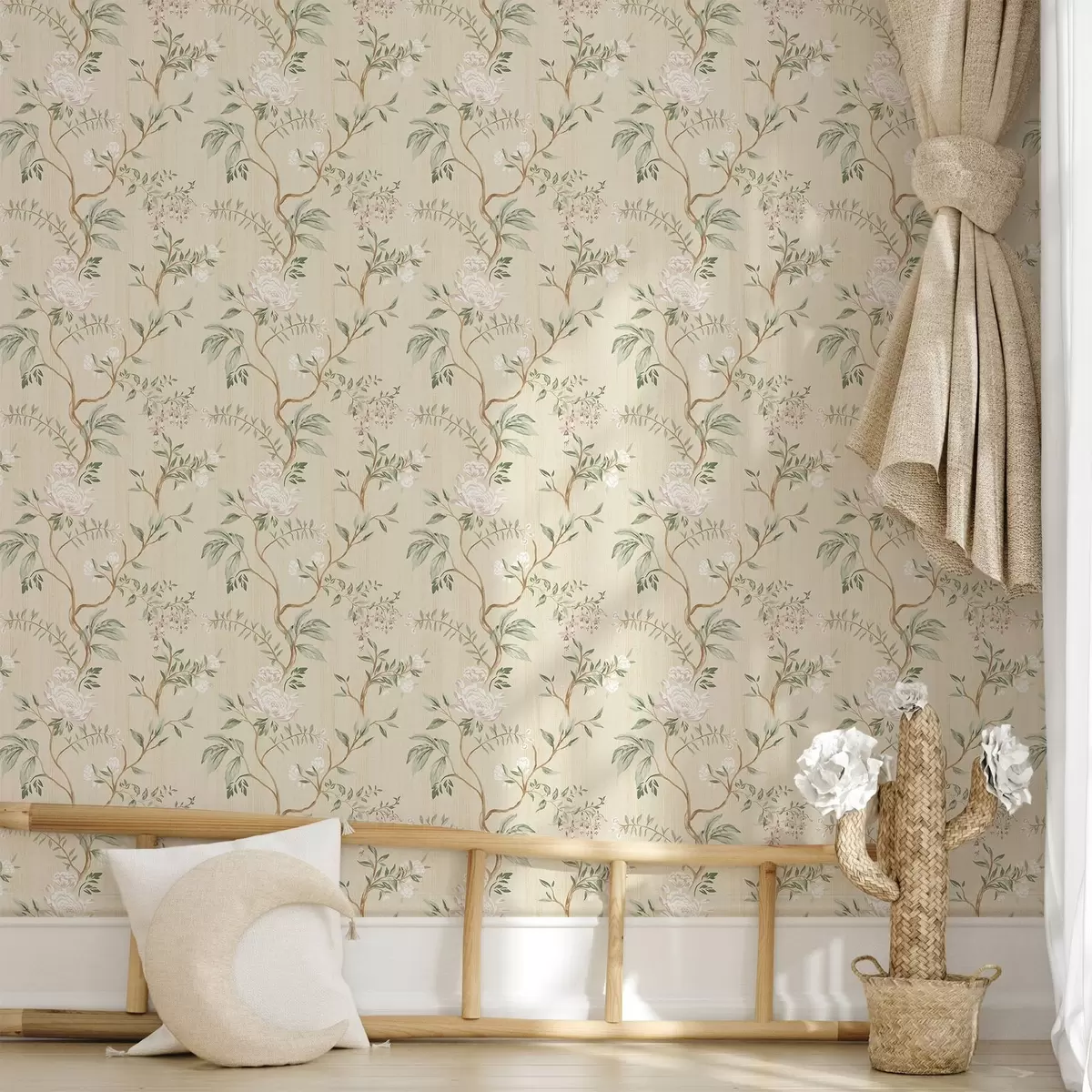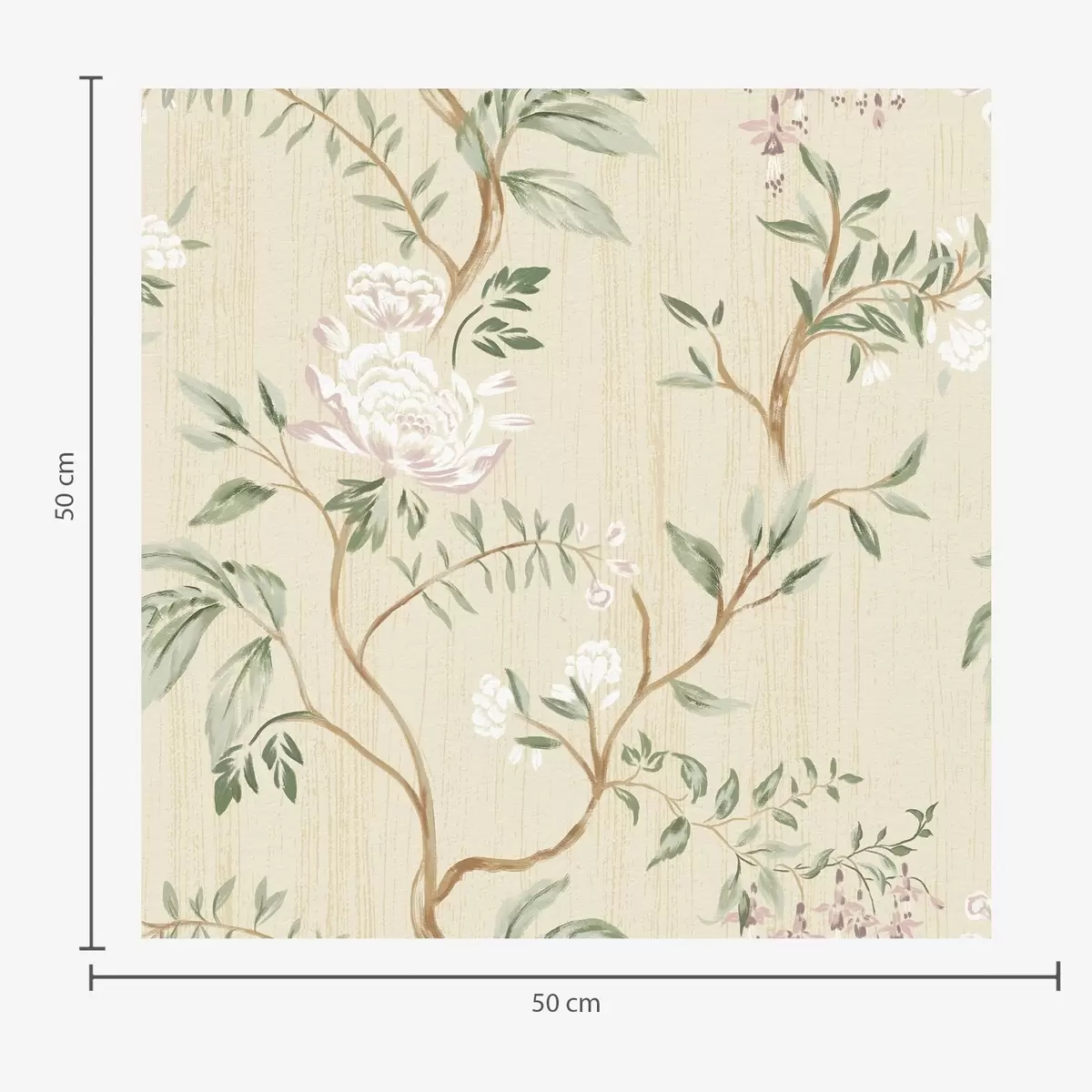 Tapeta Nežne veje s cvetovi na topli kremasti podlagi Št. a01084